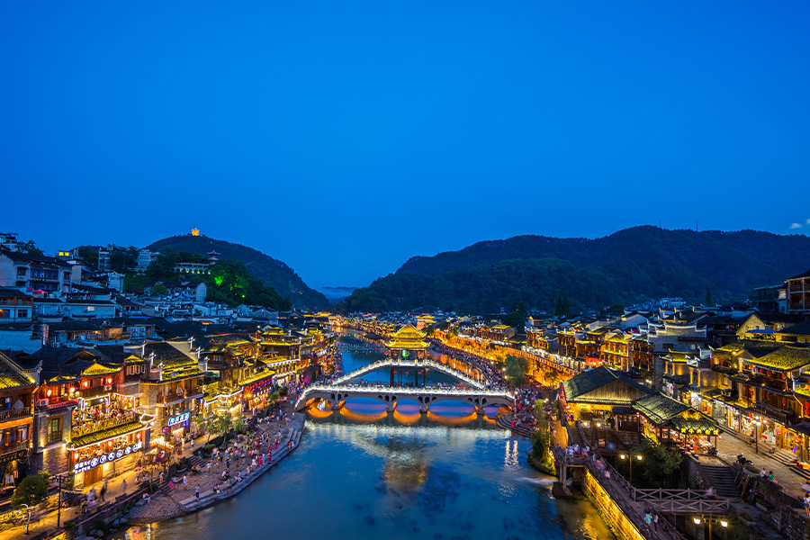夜になり、沱江の両岸にある建物も、沱江を乗り超えるいくつの橋も全部は綺麗なライトに飾られています。光があふれ、昼間の鳳凰とは完全に違う世界になるような感覚をしています。二層橋である「雪橋」は沱江を乗り越え、上部の亭より素晴らしい古城の夜景と沱江の夜景を俯瞰し、満喫できます。「最高です」、「夢幻な夜景」など、観光客には様々に褒められています。現在は中国で有名な夜景観光地の一つとなっています。古城や沱江のそばをめぐり、まるで仙境に身を置くようになっています。