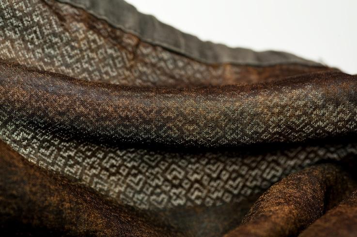 中国の絹織物の中でも上等な織物です。その特徴は、簡単に洗える上、乾きやすいこと。しわになりにくい、十分丈夫なシルクです。また、ウロコのような模様が全体に入っており、黒色の独特の光沢があります。