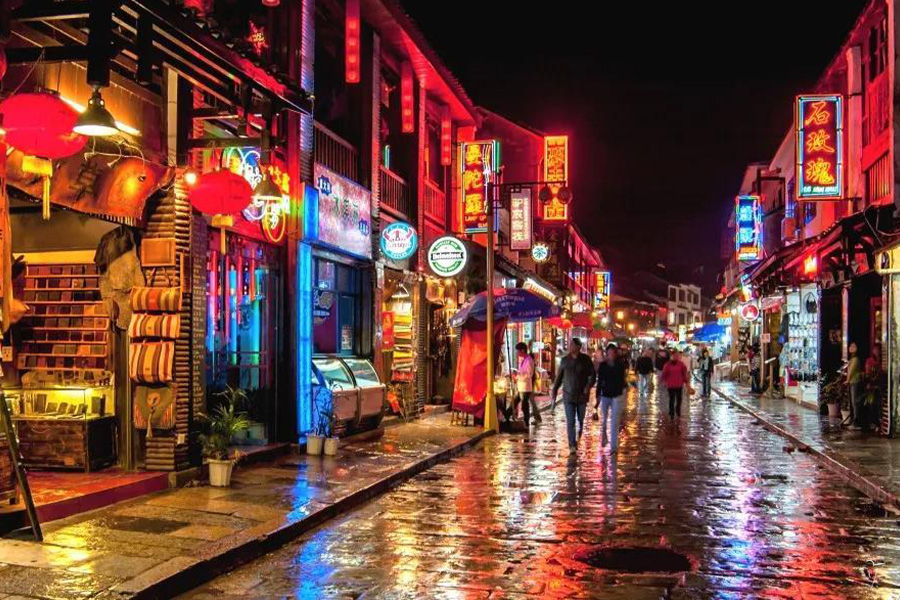 陽朔は桂林より南に約65キロ、漓江下りの終着点であり、車で行けば1時間程度で着く距離にある。西街はその中心街である。周囲は桂林観光の一番の見所となっている珍しい山々に囲まれており、桂林とはまた違った山水風景に、近年来多くの外国人が足を運んでいる。街が観光地となる以前からも多くの西洋人が滞在していたため、洋人街とも呼ばれている。西街ではほとんどの店の前に中国語と英語の看板が掲げられており、街には英語を話せる中国人が多くいる。西街には、みやげ物店や飲食店だけでなく、手ごろな値段のホテルも数多く軒を連ねており、一年中多くの観光客を迎え入れている。中国南方の伝統的家屋の姿と、石畳の街道が周囲の山々と溶け込み、穏やかな空気が流れる街で、ゆっくりと時間をかけて歩いたり、写真や絵を描いたりするにはとてもいい場所である。ごみも落ちていない綺麗な街と、山水が育くんだ新鮮な空気、この素晴らしい環境の中で、自然の魅力を堪能しきるには1、2泊は必要でしょう。周囲の見所としては、近年再整備された陽朔公園、月亮山、映画「劉三姐」の舞台となった大榕樹、蝴蝶泉、碧蓮峰など数多くある。時間のとれる旅行では、貸し自転車でのサイクリングで、自由に陽朔の街と周辺を散策することをお勧めする。