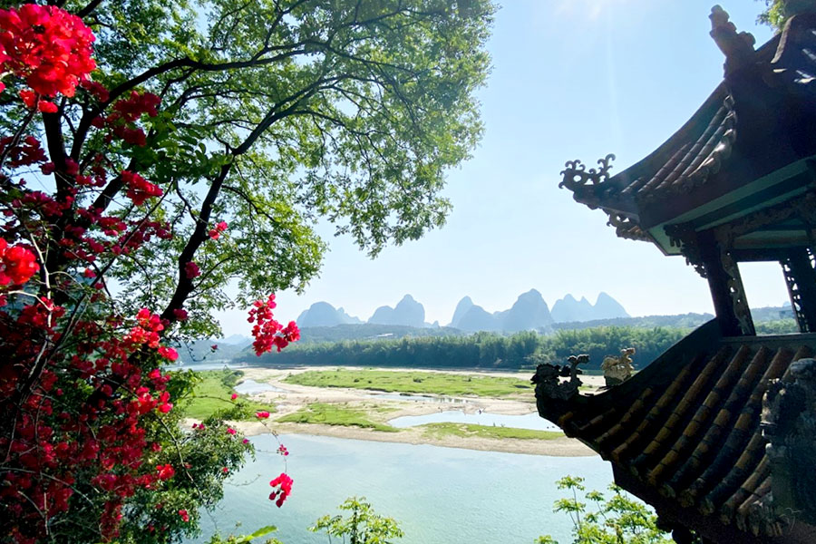 碧蓮峰でご来光を楽しめるためにいつの時代かは不明ですが、「迎江閣」という東屋が建てられました。この迎江閣は八本の柱で支えた寄棟造りの二階建ての建物で、二階を支えている八本の柱で仕切られた八枚の窓にそれぞれ陽朔を代表する八景が刻まれ、「画窓」と呼ばれています。迎江閣から周囲の景観を眺めると青く澄んだ漓江の流れと遠くに聳え立つ龍頭山などが楽しませてくれます。特に夜になると漓江下流を彩る漁火が一面に広がり、それが陽朔県の一大名物に定着したことから「白沙の漁火」と呼ばれています。