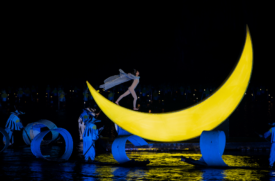 1961年に中国で上映された映画「劉三姐」は、広西チワン族の地域で伝説とされた人物で歌の仙人とも呼ばれた劉三姐は、人間における誠実さ、善良さ、美しさをテーマにした歌で当時の人々の素朴な人間性を主張し、世界中の特に華僑がいる地域で多くの支持を得て一世風靡されていました。この映画「劉三姐」に因んで創作されたのが印象•劉三姐で、桂林山水を舞台にして今までにない広々としたパノラマの視界と目の前で展開される壮大な演出に圧倒されてしまいます。この作品は人だけが作った舞台と違い、天と地の自然と手を結び見事に融合して創った「山水実景」に魅力を感じることができます。バラード調のテーマソングが流れる中、見え隠れした山並み、川に映る倒映、程よい霞みの演出、囁く竹林、空にかかるおぼろ月などがその幻想的な魅力に人々が引き込まれていきます。