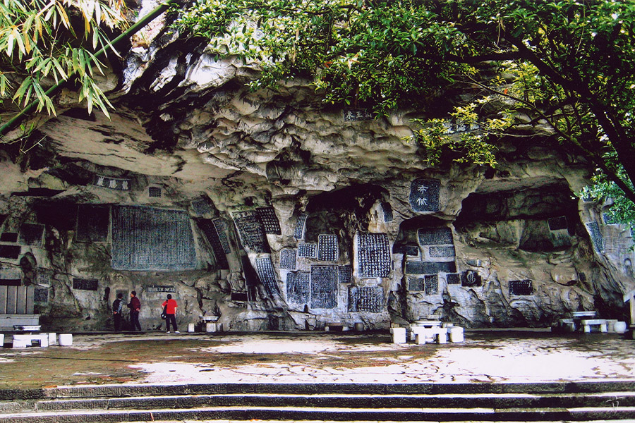 桂海碑林は龍隠岩と龍隠洞の二つの部分からなっており、中国四大碑林の一つでもあります。1600年ほど前の南北朝の時代から、近代まで合わせて200以上の石刻があります。まるで石の教科書のように石碑が並んでいます。中でも特に注目されるのは、北宋時代の「元祐党籍碑」と梅摯の「五瘴説」、清の広西巡撫(知事に当たります)梁章鉅の刻んだ「五君詠」です。