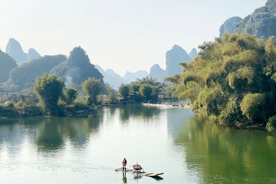 朝食後、桂林―陽朔「● 漓江 下り」、 陽朔着後、西街散策、遇龍河「●筏遊覧と鵜飼い見学」 夕食は陽朔名物料理―魚とビール煮をどうぞ。「