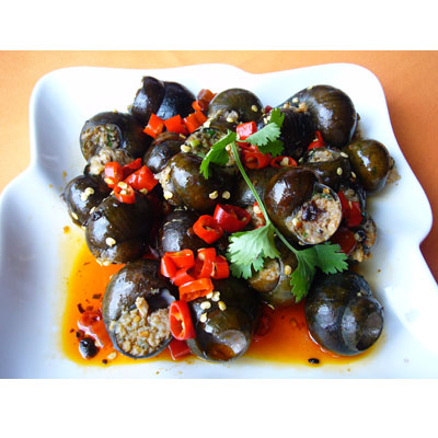 「十八醸」とは、18種の醸菜のことです。「醸菜」は、桂林の特別な料理で、各種の調味料をひき肉と混ぜてからいろいろな野菜や殻類の中に詰め、蒸したら出来上がりです。例えば、「ゴーヤ醸」はゴーヤの実を取り、ひき肉をゴーヤの中に詰めるものです。「田螺醸」は田螺の肉を出し千切りにし豚のひき肉と混ぜてから、また田螺の殻の中に詰めるものです。