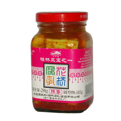 最後に、桂林の豆腐乳は上等な大豆を原料とし、複雑且つこだわりのある工程に基づき作られた伝統的特産品で、唐辛子風味と五香(五種の香辛料)風味の二種類があります。食感は柔らかく、口の中で旨みが広がり、栄養値が非常に高いと言われています。そのため、子豚の丸焼き、扣肉(あげ豚肉と里芋の蒸し物)、豚肉の醤油煮、野菜の炒め、鶏肉の水煮など、たくさんの料理に用いられています。また、お粥に入れて一緒に食べるのもお勧めです。こちらも「花橋」マークの豆腐乳が有名です。