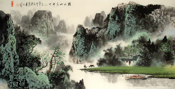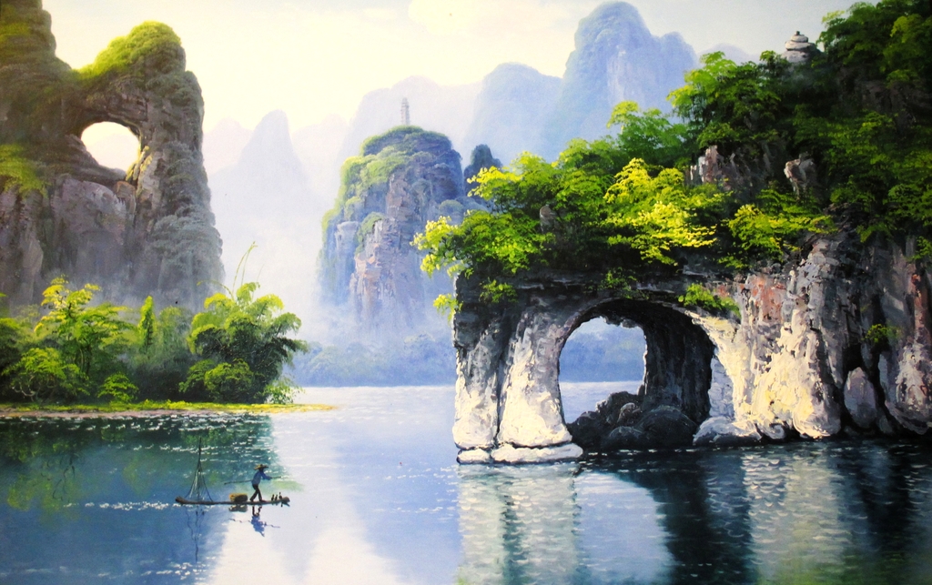 桂林は歴史が長く、昔から桂林の自然美を絵に描いて表現した文人が数多くいました。現在でも、桂林の広西師範大学、中国画学院、旅行専門大学などで美術学部に勤めている先生方が授業を通して、桂林山水画の発展と創作活動に積極的に取り組んでいます。また社会人の中にも独学で一人前の画家になった人もいます。桂林の画家は中国で、地域人口に対して画家の人口が最も多い都市といわれています。よく桂林漓江の景色を題材に描かれた山水画が、桂林山水の美しさを見事に表現したお土産として、人々に喜ばれています。表装すると掛け軸にもなり、床の間に飾ると立派なインテリアとなり、国内外からの観光客の人気を集めています。さらに桂林から中国全土に出荷・販売されています。桂林の工芸品と言えば、なんと言っても山水画をおいて他にありません。