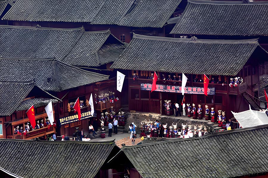 見所:郎徳上村は長いスカートが特徴の長裙苗族の村で、木吊脚楼や様々な歌と踊りのショーや、芦笙演奏をお楽しみいただけます。