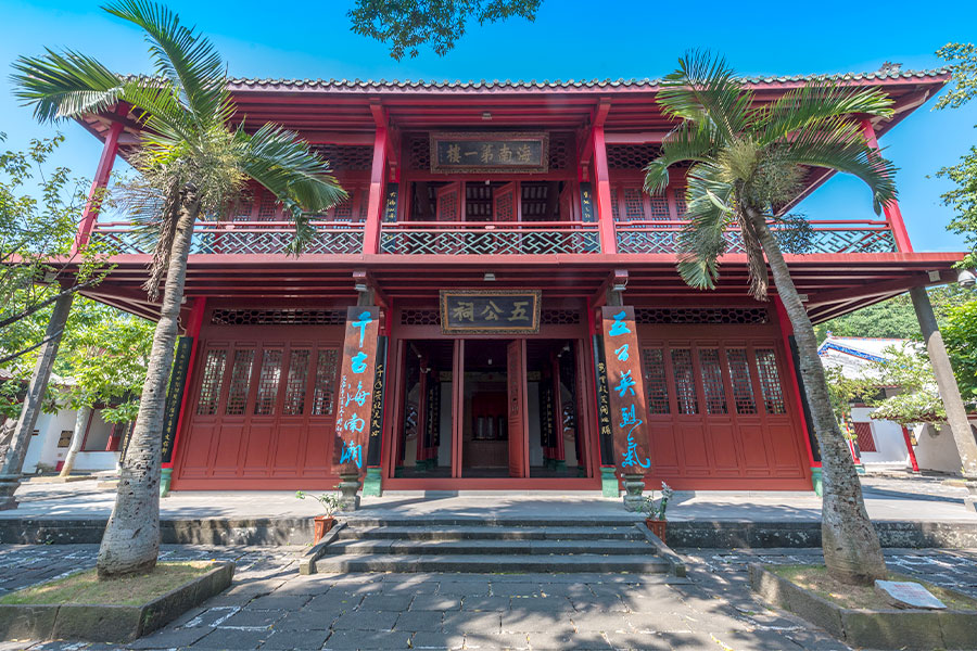 1899年に建てられた、唐・宋両代の名臣・李徳裕、李綱、胡銓、李光、趙鼎を祭った廟。日本ではあまり馴染みのない顔ぶれだが、いずれも政権抗争に敗北して島流しされた人物だ。あまり観光名所のない海口唯一の見所。海南島に島流されてきた李徳裕らなど5人の歴史人物を祭る為に、清の時代(1889年)に建てられた記念館。また、宋の時代の有名詩人である蘇東坡を祭った「蘇公祠」、漢の時代の将軍を記念する「両伏波祠」などがあり、海南島の重要文化財。「海南第一楼」とも呼ばれる。