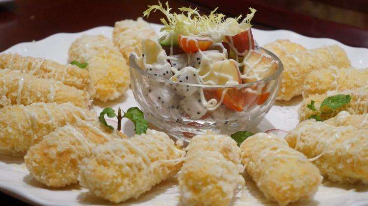 カモウリのスライスで海老と多種の条状の材料を包んで巻き、蒸籠で3分ほど蒸らしてから取り出し、蒸した海鮮巻きを皿に入れ、薄くしたオニバスをかけ、飾り文様を併べて作ります。形と色がきれいで、あっさりした味がおいしいのです。