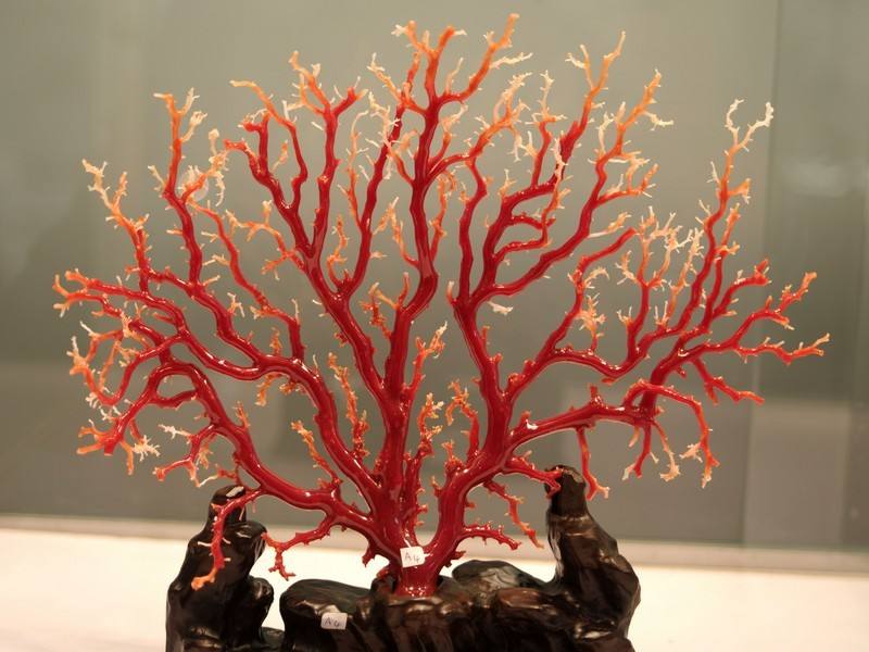 熱帯海域に生息する腔腸動物の死骸を集めた化石で、サンゴ盆栽は静物鑑賞品の中でも特に珍しく、熱帯の海洋だけに産し、「海石の花」と呼ばれています。
