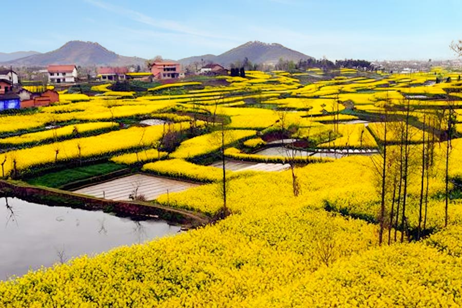 漢中市は秦巴山区にあり、気候・生態系ともに優れており、漢江が突き当って盆地になりました。盆地は一方に数十キロ以上、もう一方に200km以上の広さを誇り、菜の花もこの地で栽培され、敷地は112万ムーを超えます。毎年の春になると、菜の花が次から次へ咲き乱れ、あたり一面を黄色の絨毯で敷き詰めたような壮観な景色が広がっています。毎年、菜の花から採取される油料は14.4万t以上を誇り、菜の花が満開になる鑑賞シーズンは毎年清明節前後です。
