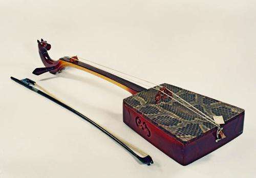 琴の上部が馬頭に飾られていることから名づけられ、モンゴル人に愛用されている楽器です。木製で、長さは約1.1メートル、弦は二本です。共鳴箱は台形を呈し、音はまろやかで、音が婉曲で低いのです。