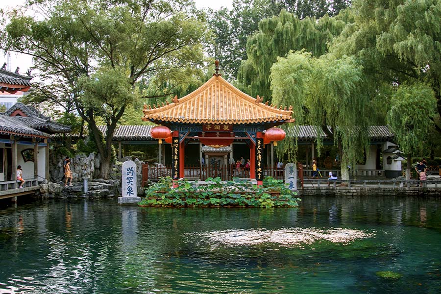 大明湖は済南市の中心、旧市区の北に位置する。趵突泉、千仏山と合わせて済南三大名勝といわれる。かつては「蓮子湖」や「西湖」という名だったが、金代に「大明湖」と呼ばれるようになった。明代に修築され、今日の大明湖の姿となった。 泉の数は百以上、その中でも名泉は七十二ある。大明湖はたくさんの泉が合流してできた天然の泉で、水は清冽で魚が泳いでいる。公園の面積は86ヘクタールで、そのうち湖は46ヘクタールある。湖に沿って垂れ柳が囲み、湖には紅白の蓮が咲いている。公園の景色はとても美しく心地よい。 大明湖園内には一閣(北極閣波)、二園(遐園、秋柳園)、四祠(稼軒祠、鉄公祠、南豊祠、匯泉祠)、十亭(...