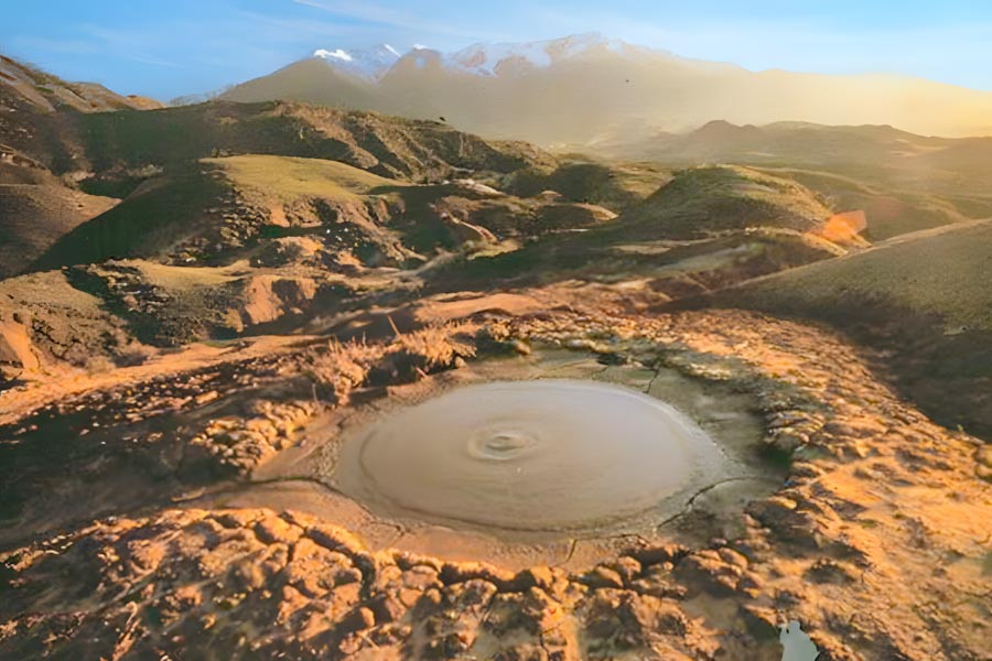 泥火山では偽火山とも言います。水、泥、砂、岩石の屑を隠し持った地下天然気体は圧力作用の上で引き続きに地表まで噴き出し、泥山になります。 独山子泥火山公園は新疆ウイグル自治区のカラマイ市の独山子山に位置し、中国の少数の泥火山の一つです。地理座標は東経84'50.8’、北緯44‘18.3、海抜は958メートルです。泥火山は二つ噴出し口があります。両者の距離は100メートルぐらいです。少し大きくのは噴出し口の直径は60cmで、地表より1メートルぐらい高くなります。少しガソリンの味を付け、粘っこい泥水は噴出し口からしきりに外に湧いていきます。集まった泥水は西南側の火口に沿って外へ溢れて、地表...