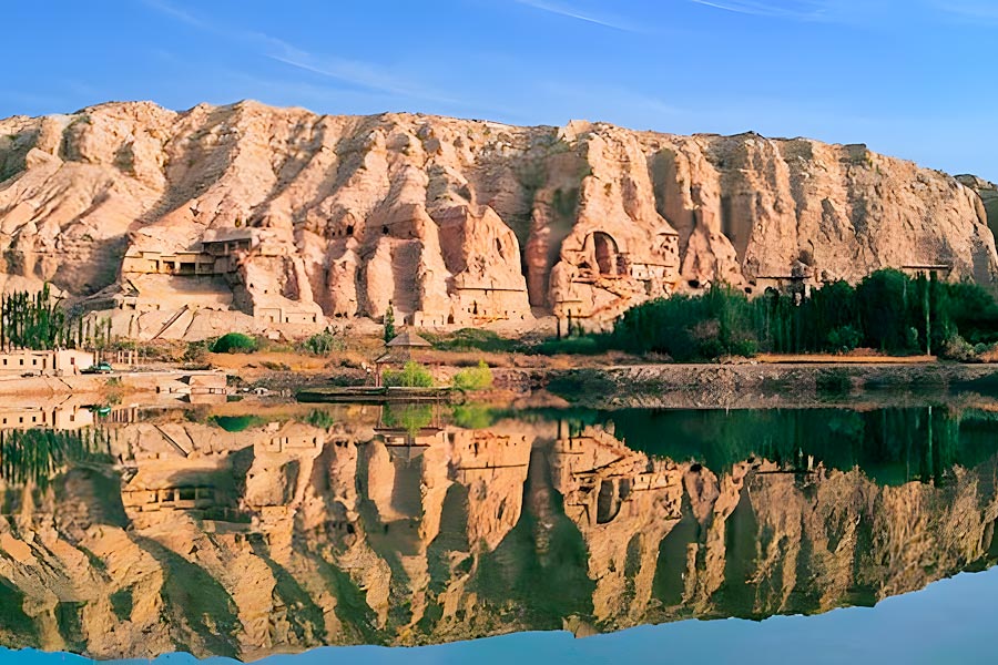 クチャから北西へ75km。拝城県のムザルト渓谷北岸に大規模な仏教石窟群が造られている。3世紀ごろから唐代にかけて300の石窟が掘られたが、塑像の大部分は破壊され、今は80余りの石窟に壁画が残されているだけ。仏教物語のほか当時の風俗を描いた壁画もある。第38窟は琵琶や横笛を奏でる様が表され、音楽洞と呼ばれる魅力的な窟。第175窟には耕作や陶器を作る様子が描かれ、当時の文化を知る貴重な手がかりとなっている。第8窟には正倉院の五絃の琵琶と同じ形の琵琶が描かれており、興味深い。