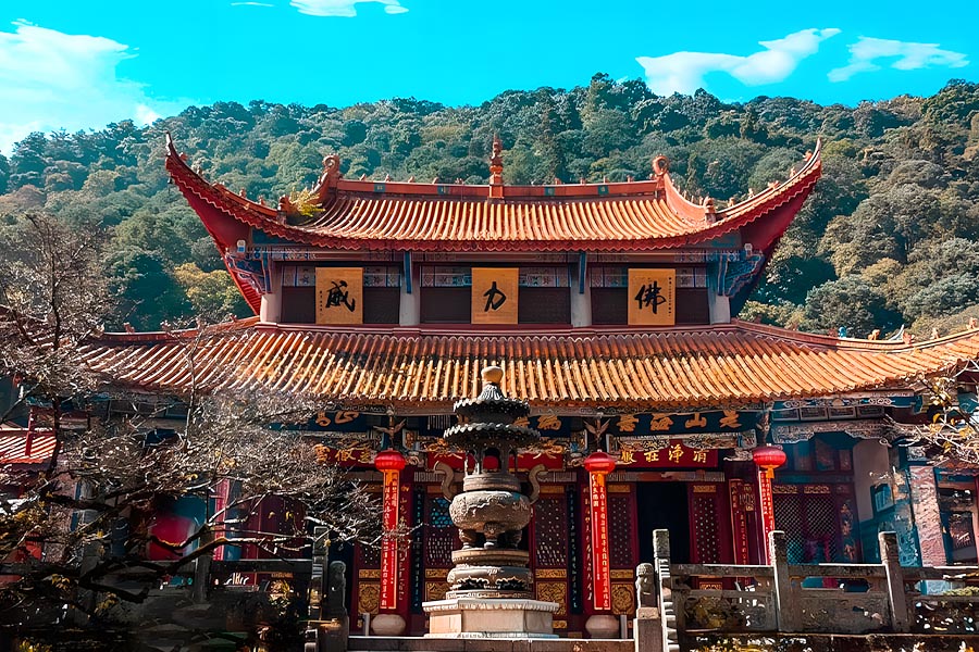 華亭寺は昆明西山華亭峰の中腹にあり、昆明最大の寺院で900年の歴史を誇る古刹。中国仏教重点寺院に認定されており、昆明西山森林公園内の主要観光スポットにもなっています。かつて大理国鄯闡侯?高智昇がこの地に別荘として建て、草花の豊富な土地だったことから高智昇の子孫がこの山を「華亭」と名付けました。また、かつての栄華を懐かしみ、現状を嘆く「華亭鶴唳」という故事により命名したとも言われます。元の延祐7年(1320年)に雲南名僧?玄峰が庵を結び修行したことが仏教寺院としての華亭寺の始まりで、玄峰は部廬舎那仏と十二円閣菩薩を祀る大光明殿を建て、「円覚寺」と名づけました。その後は崩壊と再建を繰り返し、明の景泰4年(1453年)に明の英宗帝から「華亭寺」の名を賜りましたが、たびたびの戦火で焼失し、清の康熙年と咸豊年に二度の再建工事が実施されました。1920年、近現代における中国禅宗の泰斗と呼ばれる虚雲和尚がこの地の住職を務め、長く廃寺になっていた華亭寺を再興しました。虚雲和尚は本来南向きであった山門を東向きに変え、鐘楼、蔵経閣を建て、大雄宝殿を修復し、五百羅漢を安置しました。大規模な工事が6年間も続き、再建された華亭寺は規模が大きく、現代の寺とほとんど同じ構造をしています。再建中に「雲栖」の字が刻まれた石碑が見つかったことから、寺院は「雲栖靖国禅寺」と改名されましたが、現在も人々には華亭寺の名で親しまれています。その後、1983年に中国漢族地区仏教重点寺院に認定され、1993年の火災で大雄宝殿が焼失してしまいましたが、各界の協力を得て華亭寺は全面的に改修されて、いまでも堂々とした姿を見せています。