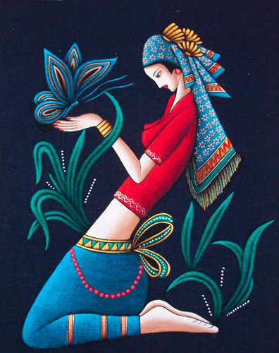 ろうけつ染めのデザインはいろいろあります。主に動物、花鳥、風景名勝などを素材にします。