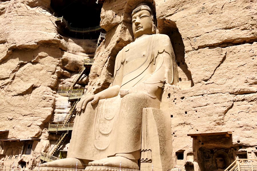 蘭州市の南西約100キロにある石窟群。黄河北岸の切り立った崖に、長さ約2キロ、上下4層にわたって大小183の石窟が掘られている。三分の二は唐代のもので、最も古い窟は西秦時代(385-431年)のもの。石窟の中には仏像や壁画が残っていて、様式は年代によって異なる。