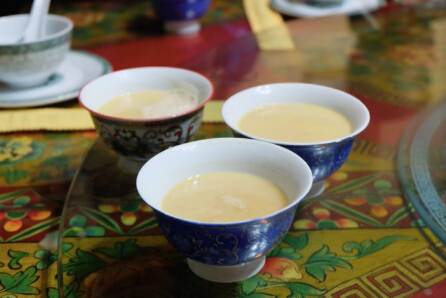 チベットでは昔から酥油茶でお客さんをもてなすという古い習慣があります。また、地元の人が遠出をする親戚や友人を送別する際は、相手に純白の「哈达」(チベット族やモンゴル族の人が相手に敬意を表すために出す絹類の物)を捧げると同時に酥油茶を一杯差し出し、道中の無事を祈ります。酥油(バター)茶の作り方は、煮詰めた磚茶(たんちゃ)の茶汁の中に塩と酥油を入れて、十分にかき混ぜた後、鍋に入れて沸かせば完成です。もし、この酥油茶の習慣はお客さんが断ると失礼にあたります。酥油茶は栄養もカロリーも豊富で腹もちも良く、消化しやすく風邪や高山病にも効き目があるので、初めてチベットを訪れた人はなるべく酥油茶を飲んだ方がよいとされています。他にもお茶の中に羊やヤクのミルクを加えたミルク茶、煮詰めた紅茶の中に新鮮なミルクと砂糖を加えた甜茶などがあります。