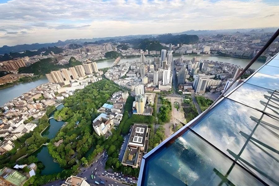 「雲頂観光」は柳州地王ビルの76階にあり、高さは303メートルで、観光と娯楽を一体化した都市高空景観と都市観光庁です。空中ガラス桟道、3 D映像、空中郵便局、エアレストラン、エアバーなどのサービス施設があります。特に言えば、空中ガラス桟道は高さ303メートル、幅1.5メートル、一周208メートルです。一周を回ると約30分くらいかかり、全国4軒目の野外ガラス観光桟道です。