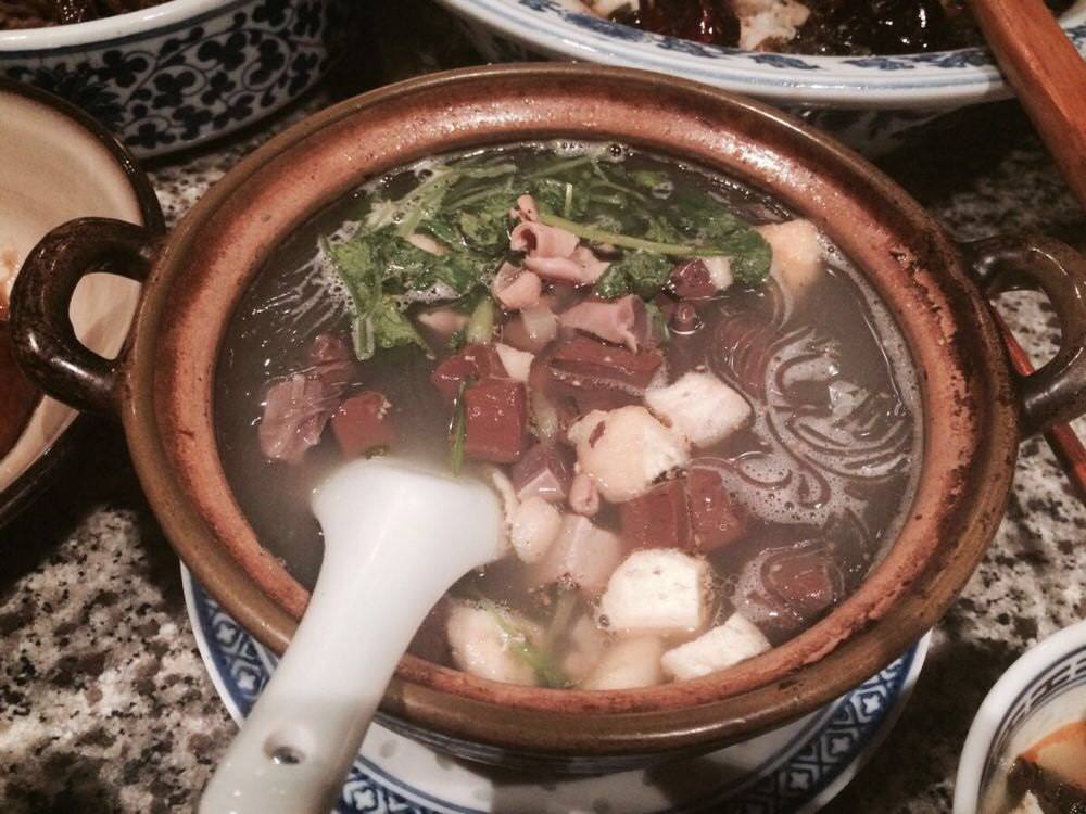 主にアヒルの血、内臓など食材にはるさめを加えて作られ、スープの香りと味は穏やかであっさりします。