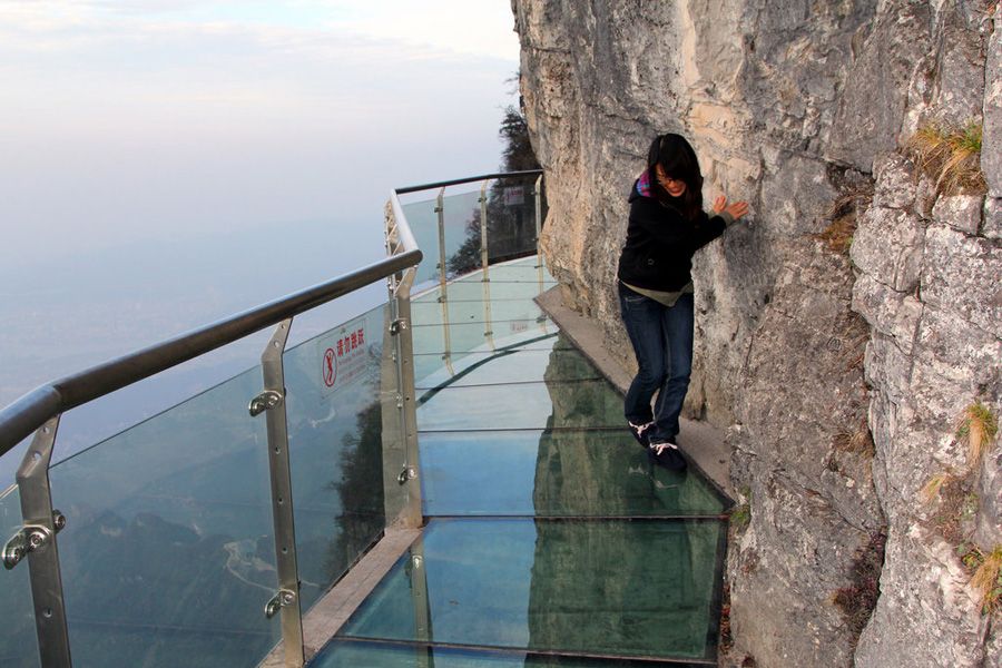 ガラス橋の美しさを維持するため、ガラス橋を通る人々は全員靴袋つけなければならない。写真のとおり、ある観光客は岩壁をささえながらガラス橋を渡っている。
