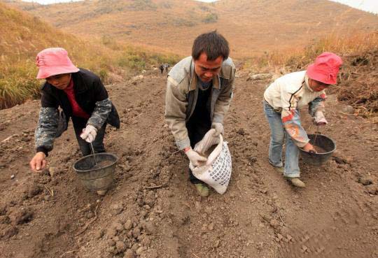 農家の人々が新たに植えるさとうきびに肥料を与えている。