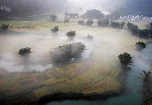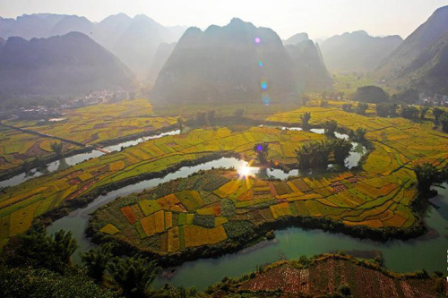 10月27日に広西チワン族自治区河池市東蘭県武篆鎮で写真に収めた美しい田園秋色。