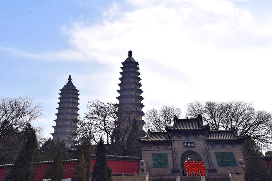 双塔寺の元名は永祚寺。寺の中にふたつの塔が聳え建っていることから双塔寺と呼ばれている。 寺内の建築物はすべてレンガ造り。升組みや瓦の構成が精巧で美しい。大殿は2層の楼閣式になっている。大殿内2階の天井のしっとりした美しさは一見の価値がある。 寺の端にあるふたつの塔は八角13層。塔内には階段があり、最上階まで上ることができる。塔内の窓からは、太原市内が一望のもとに見渡せる。 また、寺内には牧丹が植えられており、花が開く6月には牧丹を鑑賞できる。