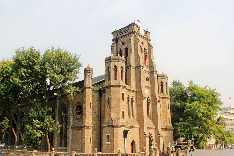 望海楼教堂は、海河橋の斜め向かい、獅子林大街の西端に位置するカトリック教会。アロー戦争(1857~1860年。「第2次アヘン戦争」とも呼ばれる)の結果締欠された条約によって、内地への布教を認められた後、フランス人宣教師が中心となって1869年に創建したもので、当初は聖母得勝堂といった。 創建当初から周辺住民との間でトラブルが頻発し、1870年には天津教案という事件が勃発し、フランス領事館とともに襲われた。その後、義和団事件(1900年)では2度破壊され、現存するものは1904年に再建されたもの。