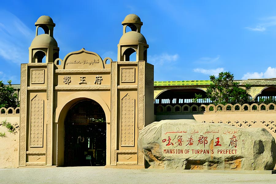 郡王府は新疆ウイグル族自治区のトルファン市から2キロ離れた魯克沁鎮に位置しており、有名な蘇公塔にも近いです。郡王府の土台として1580年に初めて造られたと考えられています。史料によりますと清の初期、額敏和卓が乾隆皇帝に王位を授けられた後、1775年に元の建造物をベースに本格的な王府を目指して大規模な工事に乗り出したというとこです。 敷地面積が約15000平方メートルに達している郡王府は高さ15M、横57M,縦40Mに及ぶ土台の上に築かれたものであり、合わせて100軒以上の部屋から構成されています。宮殿などを巡る建物の面積が約2500平方メートルに及んでいます。中には議事堂...