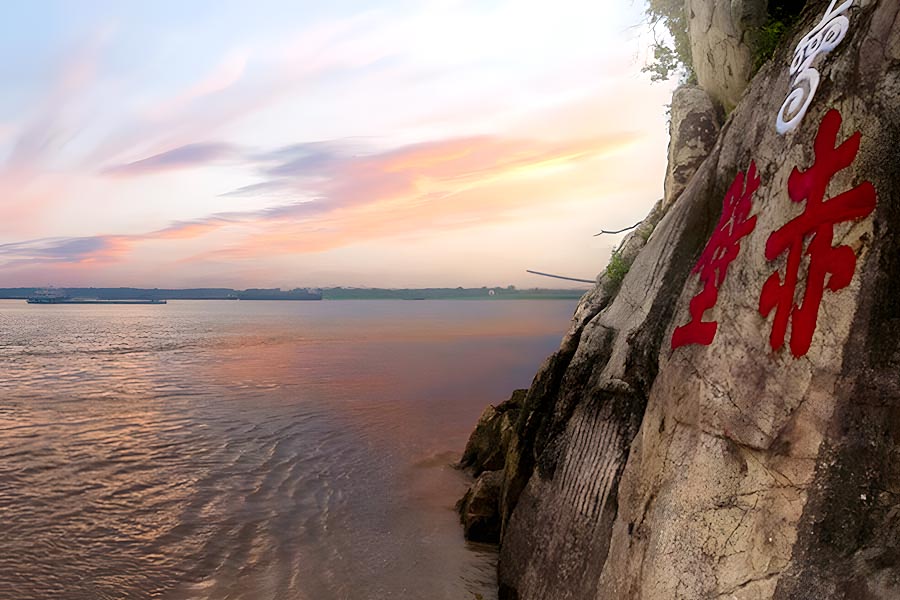 「赤壁摩崖石刻」は赤壁の長江沿いの崖にあります。「赤壁」という赤い字が書かれており、150センチの長さと104センチの幅を持っています。周瑜が曹操を倒した後、勢いで石で書いてやったという説がありますが、字体によって考証したところ、唐代の人が書いたと考えられています。