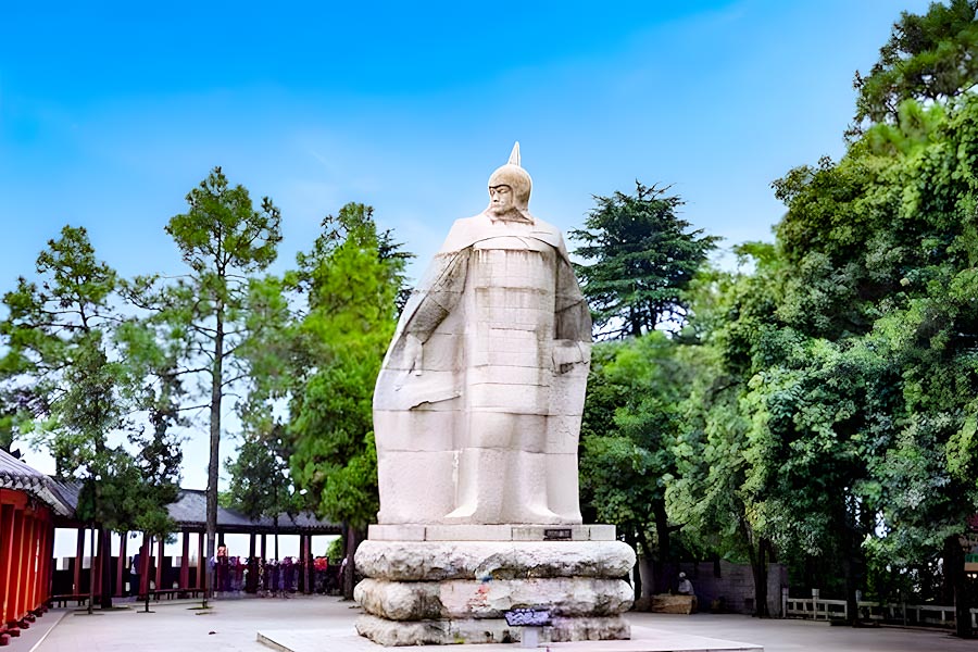 周瑜彫刻像は赤壁の長江沿いの所に位置しています。1991年の1月に湖北省博物館美工の陳志新によってデザインされ、彫刻が8.58メートルで、身長が6.58メートルあります。台座は高さも幅も2メートルで、長さが3メートルあります。周瑜彫刻像は26個の花崗岩によって作られ、重さが113トンあります。 周瑜彫刻像は周瑜が鎧を身につけ、マントを羽織り、手に剣を持っている立派な姿を表しています。