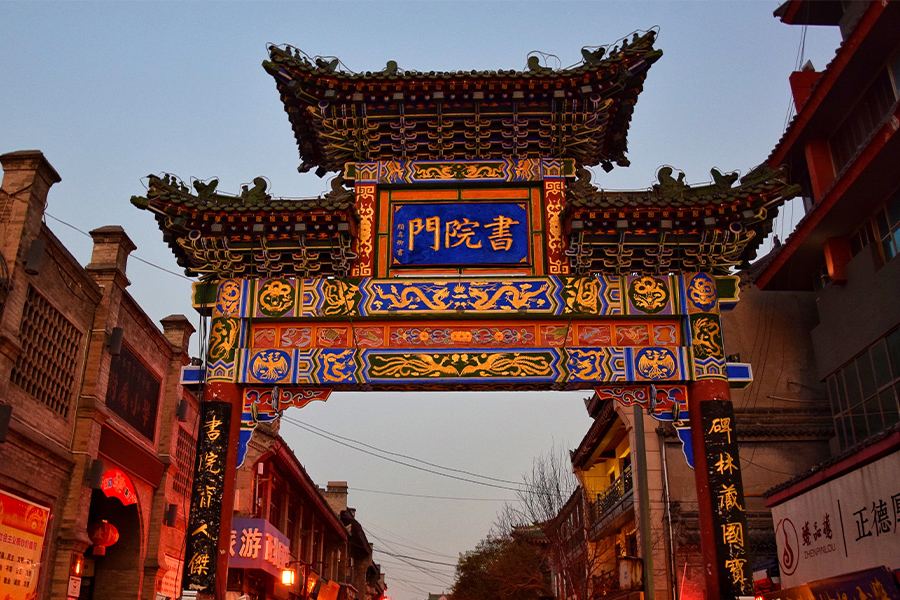 城壁の永寧門(南門)の東側に、書院門と書かれた大きな門がある。門をくぐるとそこには書画や文房四宝を売る古い店が軒を連ねている。ここから碑林まで約570mの間、通り一帯は伝統的建築様式で建てられた土産物店が集まる古文化街である。主に書画、骨董、工芸品などを売っているが、中には漢方薬店や銘茶の店もある。英語、日本語が通じる店も多い。書道家や大道芸、工芸職人などのパフォーマンスが行われていることもあり、碑林の帰り道に買物ついでとして散歩するのにちょうど良い。また、老孫家や徳発長など老舗の分店もあり、お腹と心を満たす食事もできる。