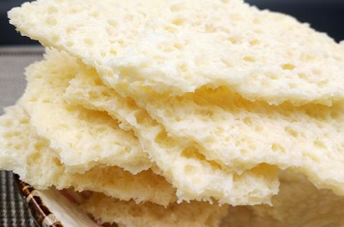 乳皮の制法は新鮮な牛乳を鍋に入れて煮た後、火力を控え、弱火で煮、そして絶えずかきまぜ、水分をゆっくり蒸発させます。牛乳の汁は濃縮し、鍋の底で凝集して円形の黄色い餅となり、涼しい所で陰干し、出来上がります。乳皮は白色に黄色が付き、蜂の巣穴に似て、クリームの香りがあふれて、柔らかくて味がおいしいのです。油がなく飽きることがなく、栄養が豊富です。