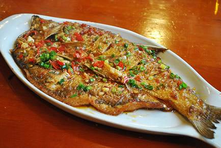 乾板魚は青海省で産出されるコウ魚を原料とします。湟魚は青海湖の特産物であり、柔らかくて味が美味しいことで有名です。湟魚の内臓をとって、きれいに洗った後、熱した石板や砂浜に大小の順に並べて干し、木板のようにならんだ干し魚の束にします。食用の時、コショウ、トウガラシ、サンショウなど薬味を粉末にしたものと小麦粉の中でペースト状にし、洗浄した乾板魚に塗って蒸したものを食べられます。このようにして作られた乾板魚は、辛みが強くて美味しいのです。