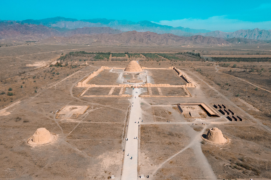 市内から西へ約40KM行った賀蘭山東麓にある西夏(1038年~1227年)の王墓群。平原から突き出ている盛り土のようなものが西夏王陵で、独特の形をしている。東西4KM、南北10KMのエリアに9つの皇帝陵と70あまりの陪葬墓が残っている。建国王李元昊の陵墓である泰陵はひときわ大きい。もともとは霊台という八角形をした塔だったが、風化して現在のような円錐形になってしまった。墓室は地下に造られた。