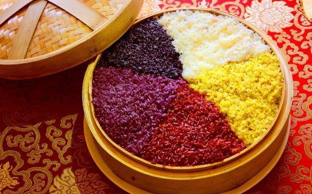 五色モチご飯は元陽地区の伝統的な軽食です。ハニ族の祭祀に欠かせない食べ物の一つでもあり、他の祭祀に使います。黒、赤、黄、白、紫の五色あります。