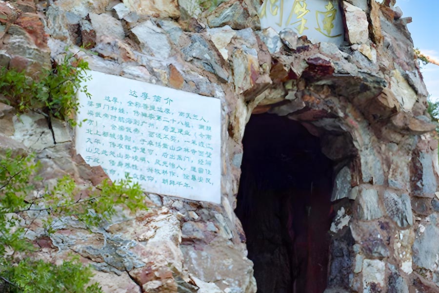 初祖庵の背後の五乳峰の中腹に達磨洞という洞窟がある。達磨が9年間、壁に面して坐禅したところと伝える。 石洞はひっそりとしていて、深さは約2丈・広さは1丈で、入り口は西南を向いている。洞窟の壁は掘った痕があり、水面の波紋に似ている。洞窟の外には石坊があり、明代に乾清宮の宦官だった胡斌が建てたもので、表面には『西來肇迹』、裏面には『默玄處』の3文字が刻まれている。西側の石壁には、明代の長垣人である蘇民望の七言絶句が刻まれている。『西來大言誰能竅/五乳峰頭九載功/若道眞詮塵内了/達磨應自欠圓通』。面壁洞の西の傍らに穴が一つあり、下から上に穿ってある。伝えるところでは、これは火龍洞で、達磨が洞...