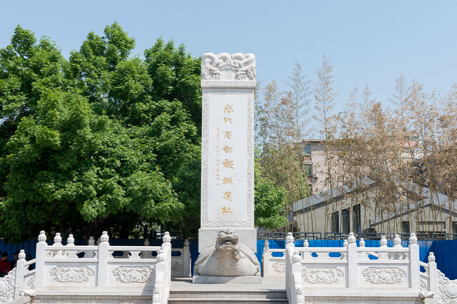 鄭州市街地、城東路と城南中路が交差する一帯に残る3500年前の商代の城壁遺跡。安陽の殷墟よりも早い時期の商の都城とされ、25平方キロに渡る地域に7キロの城壁が残されている。この地から商代前期の王宮祭器を代表する青銅の鼎が2件出土している。 遺跡には他にも住居や貯蔵庫、井戸や堀、墓地の跡が確認され、大量の青銅器や石器、陶器や原始磁器、玉器などが出土している。