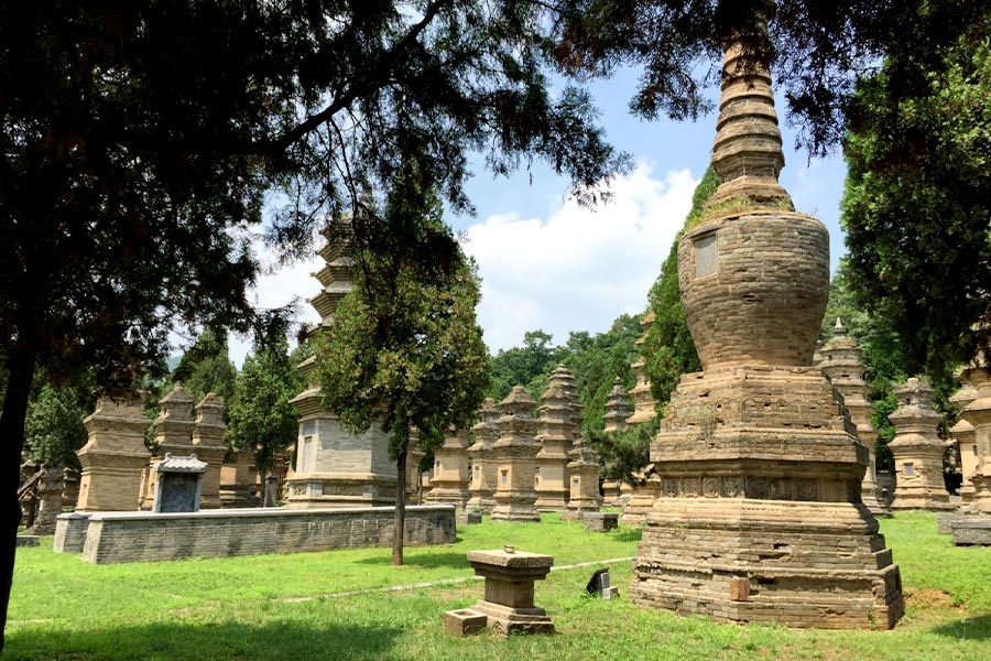 「塔林」は、少林寺から西へ400m程先のふもとにあり、少林寺歴代の高僧の墓である。1万4000平方メートルの敷地には、240余のレンガで造られた塔が、まるで林のように点々と立っていることから、この名が付いた。 塔の高さは一般に1級から7級まであり、最も高いもので15mあり、形も正方形、長方形、六角形、円形、柱形、錐形、瓶形、ラッパ形など様々だ。また、仏教のルールに従い、名僧、高僧こそが宮殿や塔を建て名を刻み、功徳を施すことが出来るため、その地位や威望の程度によって塔の形も多種多様である。 これらの豊富な塔の種類や銘文は、仏教史、古代建築や書道、彫刻芸術を研究する上で、大変貴重な材料と...