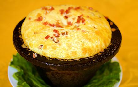 鉄鍋の蓋に火をつけて赤くし、卵とハムレットはボウルに入れて、かき混ぜてつくります。卵とハムがよく混ぜて、美味しのです。