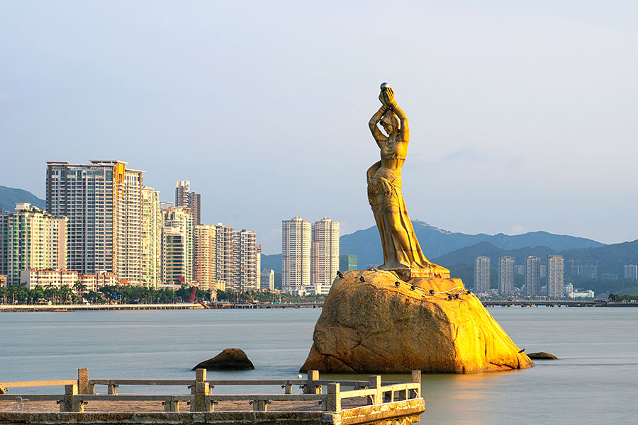 珠海の海辺に立つ町のシンボルである。海辺の岩の上に優美な姿で立っている。 目は閉じて、顔は下を向き、頭上に両手で真珠を持ち上げている姿は、どこかもの悲しい。その昔「夜明け珠」と呼ばれる大きな真珠を獲るために、1人の乙女が犠牲になったという伝説に基づいている。珠海の地名も、その伝説に由来している。中国人に人気のリゾート地。現地のビールのラベルにもなっていて、日曜日は観光客でにぎわう。